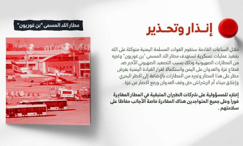 ودعا القيادي الحوثي شركات الطيران العاملة في مطار “بن غوريون” إلى المغادرة فوراً، وحث جميع المتواجدين، خاصة الأجانب، على الإخلاء حفاظاً على سلامتهم، محذراً من تبعات استمرار التواجد في المنطقة.