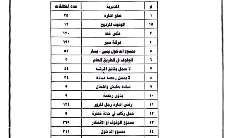 وبحسب التقرير فقد بلغ إجمالي عدد المخالفات المرورية المسجلة 1816 مخالفة بمختلف أنواعها، فيما تم تسجيل 15 حادثًا مروريًا على مستوى المديريات نتج عنها حالة وفاة واحدة وعدد من الإصابات تراوحت بين المتوسطة والطفيفة، إلى جانب خسائر مادية قدرت بنحو مليون ومائة وعشرين ألف ريال يمني.