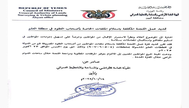 أعلنت الهيئة العامة للأراضي والمساحة والتخطيط العمراني فرع محافظة أبين عن تمديد فترة عمل اللجنة المختصة باستلام ملفات المواطنين من أصحاب العقود المصروفة لهم من الدولة في مخططات (4، 5، 6، 7، 9) بمنطقة العَلَم، وذلك حتى يوم الخميس الموافق 23 أكتوبر 2025م.