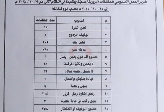 سجلت إدارة شرطة السير بالعاصمة عدن خلال الفترة من 9 حتى15 أكتوبر 2025م عددًا من المخالفات والحوادث المرورية ضمن تقاريرها الأسبوعية التي ترصد مستوى الالتزام بقواعد وأنظمة المرور في مديريات العاصمة.