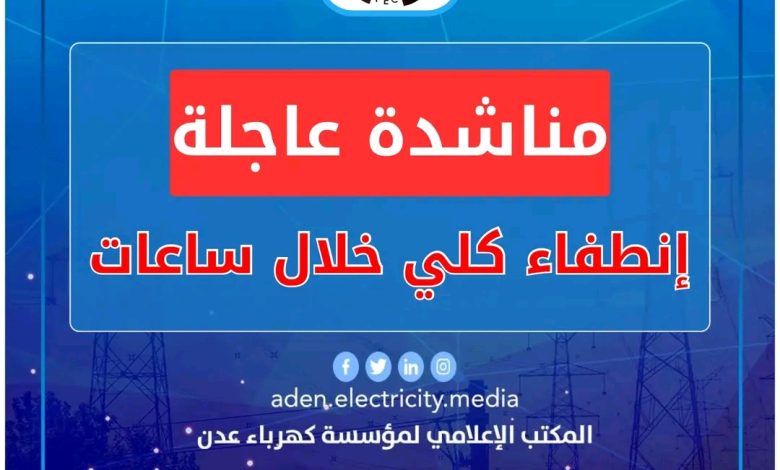 تناشد المؤسسة العامة لكهرباء عدن مجلس القيادة الرئاسي ورئاسة الحكومة بالتدخل العاجل لتوفير وقود محطات الكهرباء، وذلك لتفادي التوقف الكلي لمحطات التوليد ودخول العاصمة عدن في ظلام دامس.