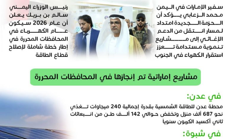 وأكد رئيس الوزراء الدكتور سالم بن بريك أن عام 2026 سيكون عام الكهرباء في المحافظات المحررة، موضحًا أن الحكومة تعمل بالشراكة مع الأشقاء والأصدقاء على تحويل هذا الهدف إلى واقع عبر حزمة مشاريع متكاملة في قطاع الطاقة التقليدية والمتجددة.