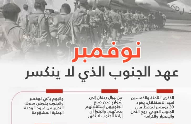 أطلق ناشطون جنوبيون اليوم حملة إلكترونية وإعلامية واسعة تحت وسم #نوفمبر_استقلال_الجنوب_يتجدد، قبيل حلول الذكرى الثامنة والخمسين لعيد الاستقلال الوطني في 30 نوفمبر 1967، بهدف تعزيز الوعي بقضية شعب الجنوب العربي التحررية ، وتجديد العهد بالقيادة السياسية الجنوبية ممثلة بالمجلس الانتقالي الجنوبي برئاسة الرئيس القائد عيدروس قاسم الزبيدي.