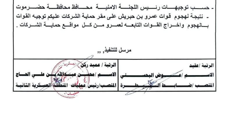 وجاء في الوثيقة الرسمية الصادرة عن مركز السيطرة بالمنطقة العسكرية الثانية، أن التوجيه صدر بناءً على تعليمات رئيس اللجنة الأمنية – محافظ حضرموت، عقب الهجوم الذي نفذته مجاميع عمرو بن حبريش على مقر حماية الشركات، وما ترتب عليه من توتر أمني يستوجب تدخلاً عسكرياً مباشراً.