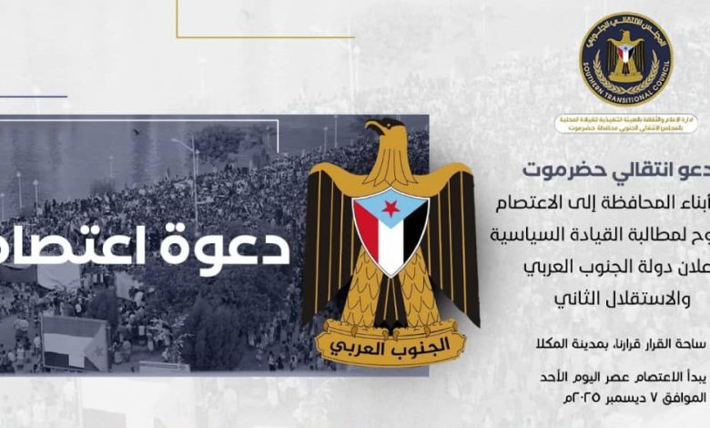 وأكد انتقالي حضرموت في بيان الدعوة أن الاعتصام يأتي ضمن الفعاليات الشعبية المتواصلة في محافظات الجنوب، والتي تعكس الإرادة الشعبية المتصاعدة نحو استعادة الدولة الجنوبية وبناء مستقبل جديد يضمن الأمن والاستقرار والتنمية المستدامة.