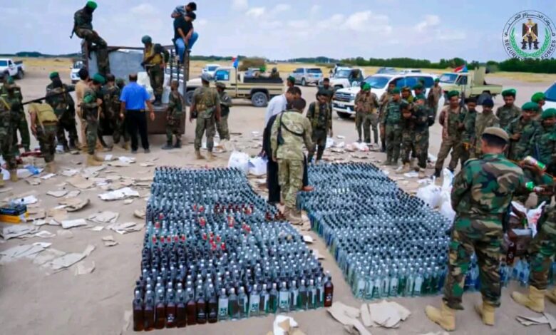 باشراف العميد الوالي.. إدارة مكافحة المخدرات بقوات الحزام الأمني تتلف (2795) قارورة وعلبة من الخمور المهربة