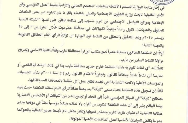 وحذرت الوزارة جميع الجهات الإعلامية والمنصات الإلكترونية من التعامل مع أو نشر أي مواد أو تقارير تصدر عن هذه الشبكة وتتعلق بمحافظات خارج نطاق عملها الجغرافي المصرح به (محافظة مأرب)، محمّلة إياها المسؤولية الكاملة عن أي مخالفة.