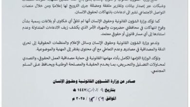 الجنوب اون لاين -خاص نفت وزارة الشؤون القانونية وحقوق الإنسان، بشكل قاطع، صحة ما يتم تداوله ونشره عبر بعض المنصات…